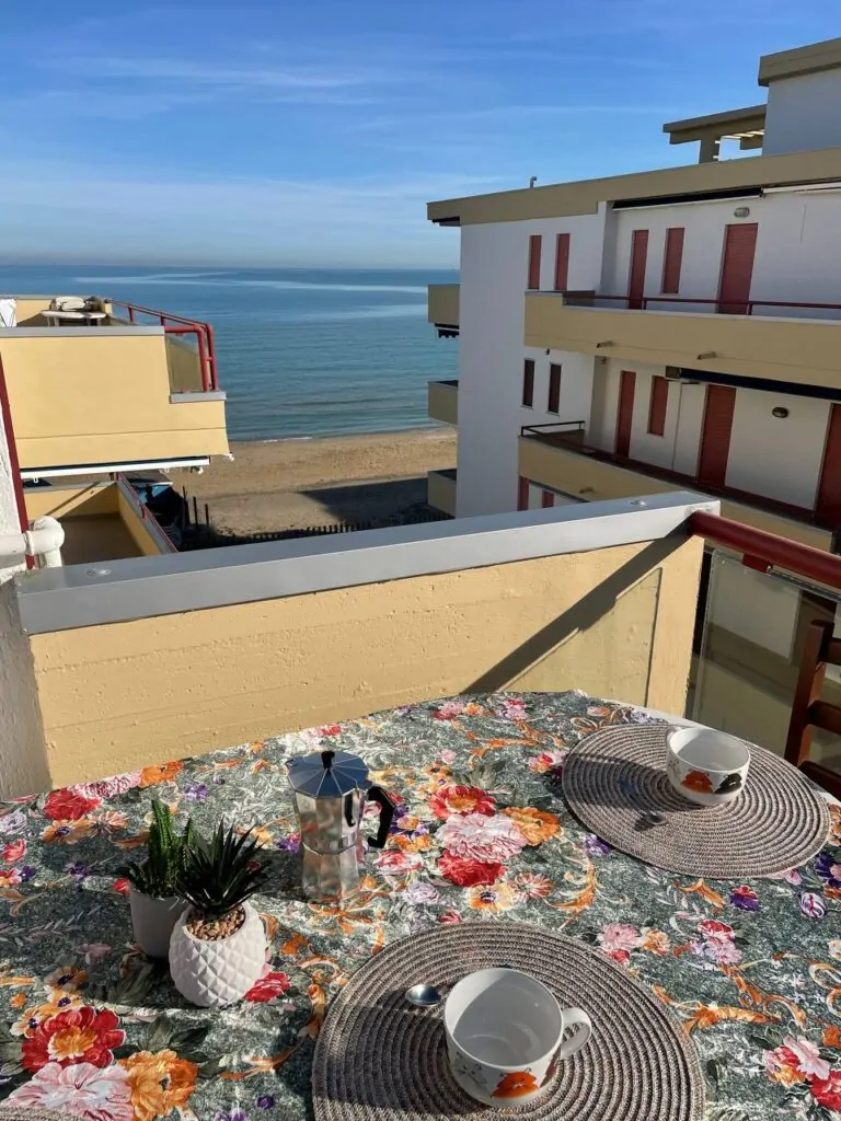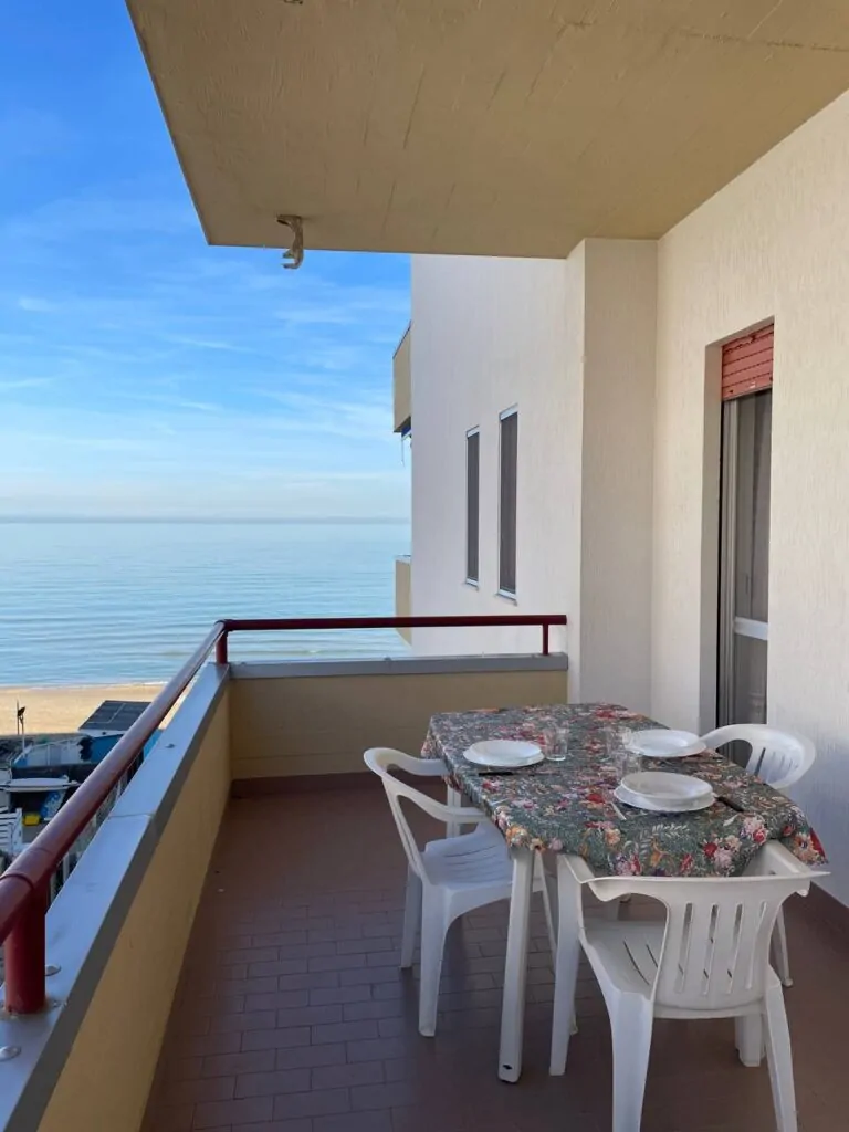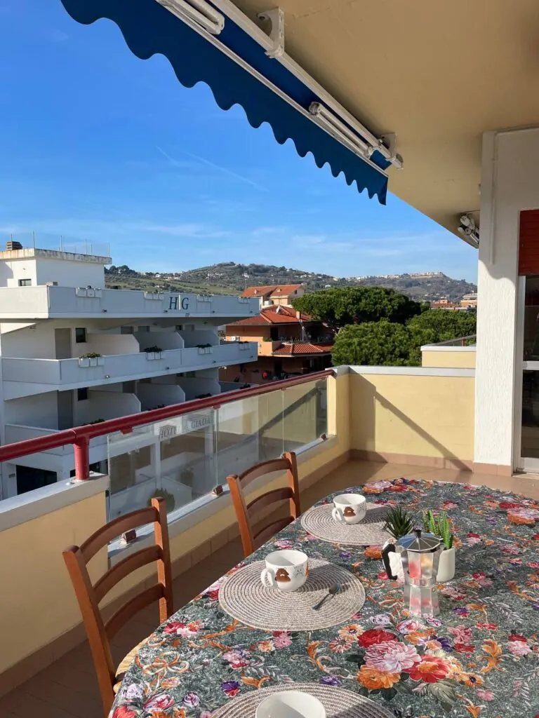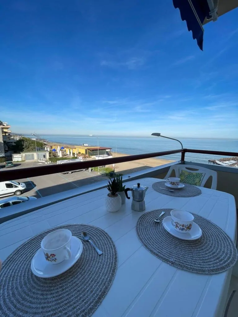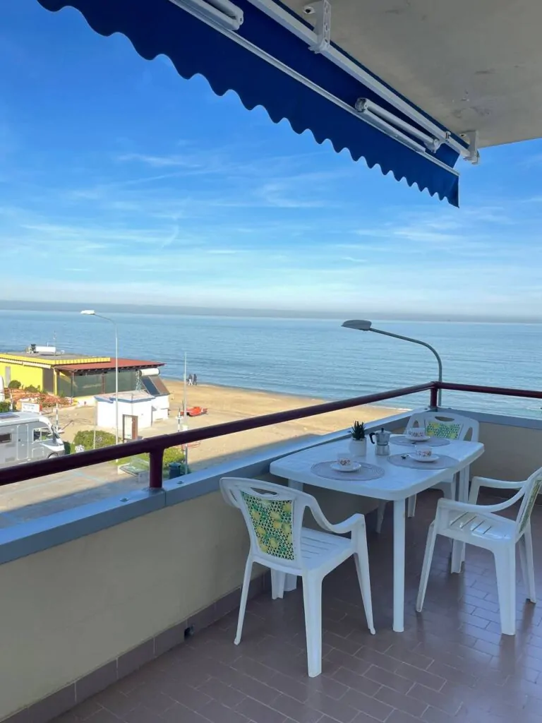 - Ampio balcone attrezzato per mangiare all’aperto con vista mare.